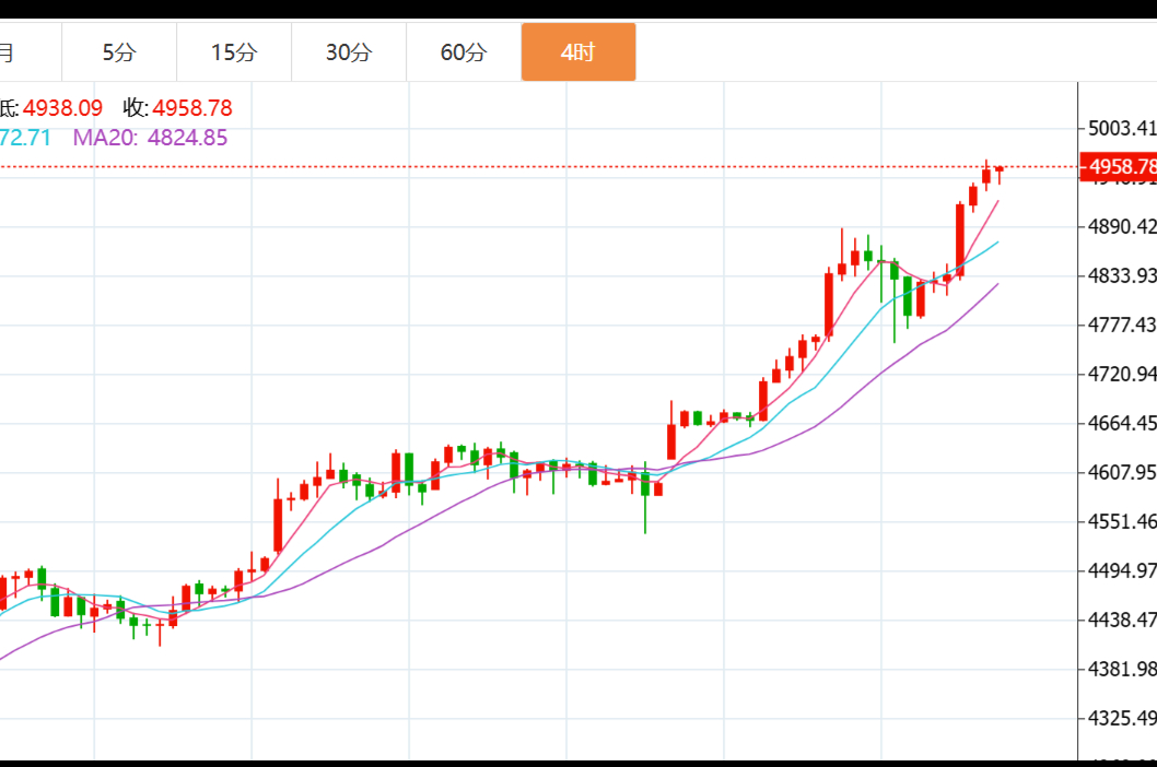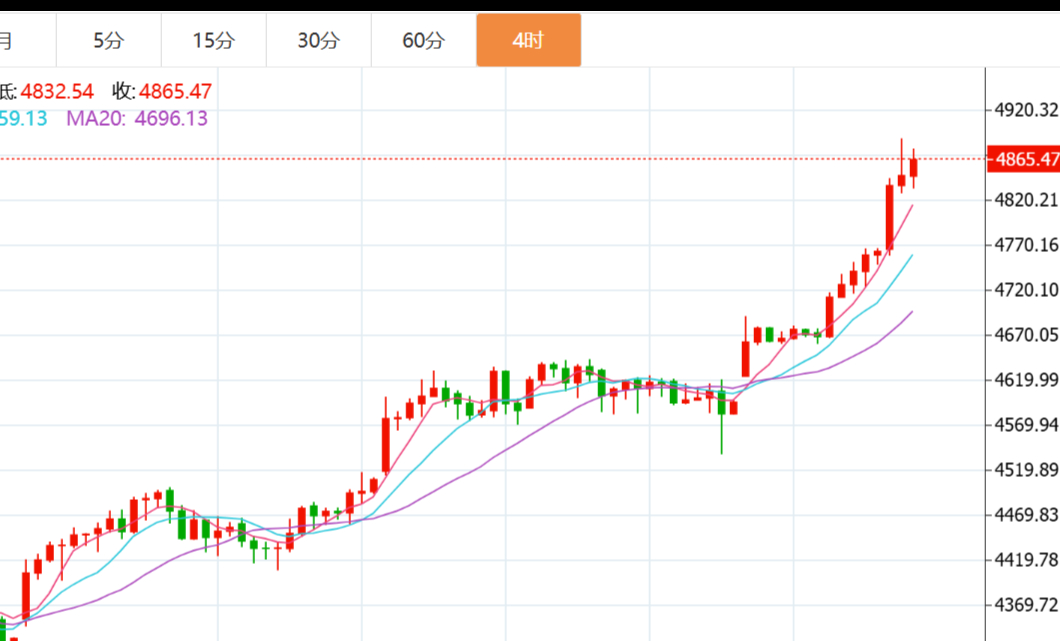 黄金技术面分析:黄金昨日早盘4832附近先回落,日线最低触及4770一线震荡反弹,美盘时段日线受到基本面影响强势拉升,日线破位前日高点后最高触及到4940一线整理,日线最终收线在4937一线以一根下影线极长的大阳线收线。早盘拉了30多个点,接近5000整数关口,目前多头高位震荡,给冲击5000一线也形成了不小的力量,虽然一直强调做多是主要趋势,但是也要注意回撤的风险,目前下方支撑4900附近,不破可以多一下。如果行情跌破4900,下方看顶底转换4888一线,触及可以再多。上方阻力日内高点4963一线没站稳前不追多。4小时,随机指标暂时金叉向上,MACD双线向上运行,整体看涨向上运行,形态上连阳上升主多看涨延续。1小时均线继续金叉向上的多头排列,黄金上涨力度十足突破高点4888一线之后持续发力,短线已经形成在4900-4890附近形成支撑,不过急涨之后先不要追,耐心等待回落继续多。综合来看,黄金下周短线操作思路上贺博生建议回调做多为主,反弹做空为辅,上方短期重点关注5010-5030一线阻力,下方短期重点关注4965-4945一线支撑。