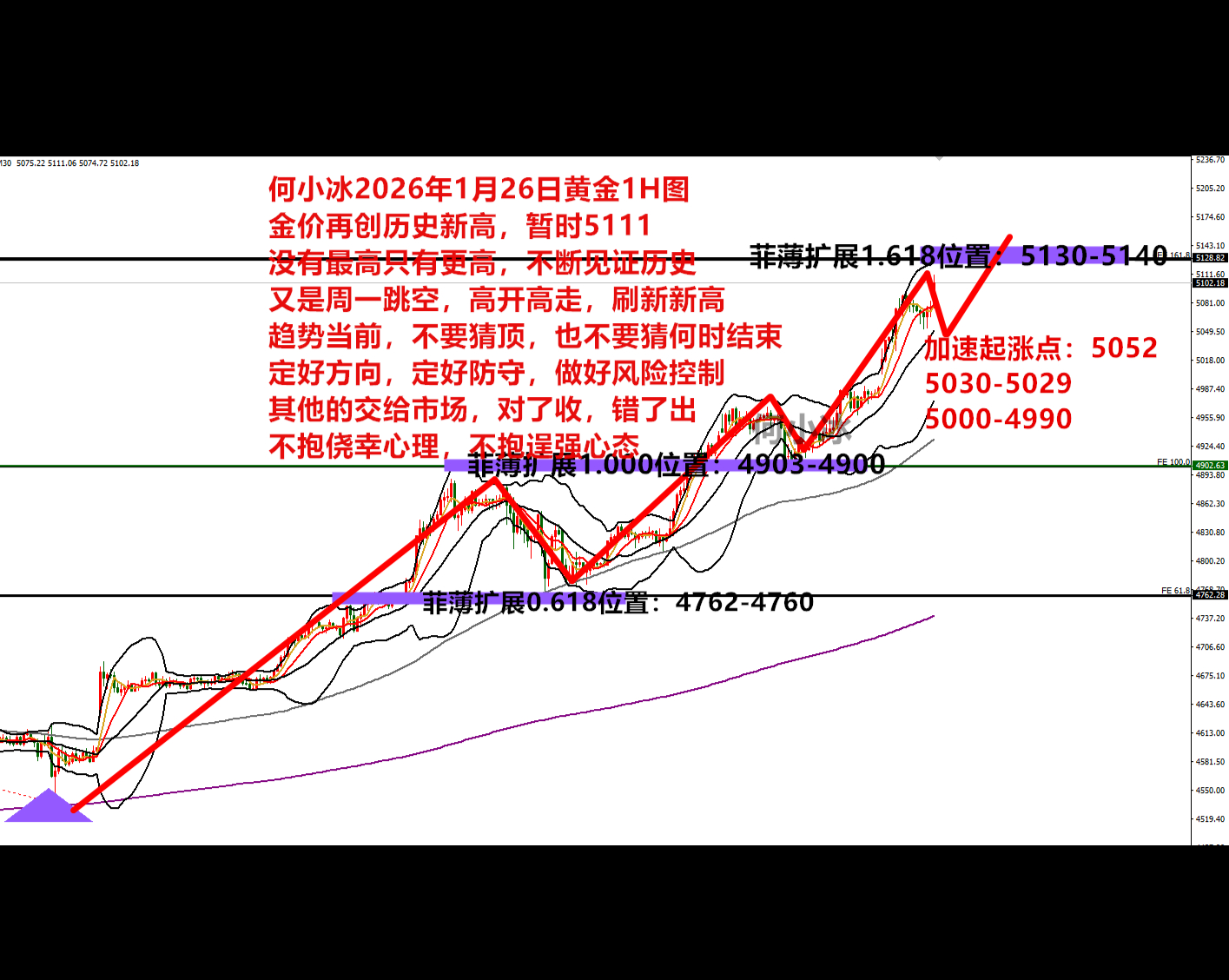 黄金消息面解析:黄金市场目前展现出极强的上涨动能,现货黄金在前一日短暂回落至5000美元下方后迅速反弹,周二(1月27日)一度上涨近1.7%至5094.54美元/盎司,连续第七个交易日保持积极走势,逼近周一创下的历史高点5110美元。这一轮强势行情的背后,是全球避险需求激增、美元指数显著疲软以及市场对美联储鸽派立场的强烈预期共同推动的结果。尽管周三美联储政策决议可能引发短期波动,但从基本面与技术面综合分析,黄金整体上行趋势依然稳固,回调空间有限,最小阻力方向继续指向更高位置。