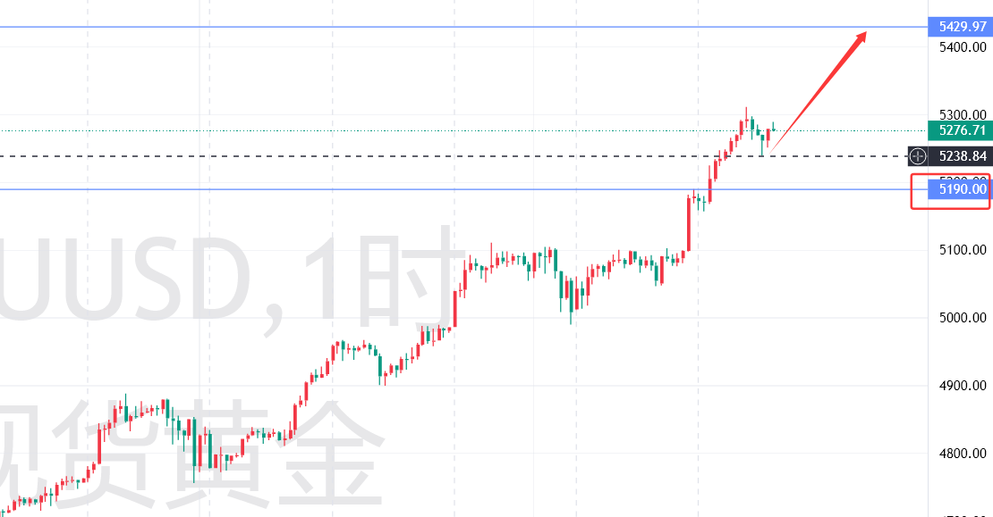 小时级盘面上来看,下午的5311这里是一个回调位,下方的支撑可关注5190这里,虽然与现价有近百点的距离,但金价只要没有跌破此位置,那么是可以持续去做多看涨的,短期支撑先关注美盘前回调低点5240这里,此位置可作为一个多单进场信号;上方的目标位扩展至5430附近。
