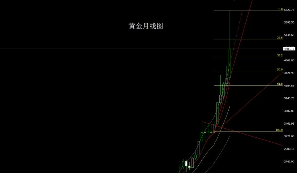 黄金市场上周完成1月的最终构造,全月的涨跌都是历史级别未见的,月初开盘在4337的位置后行情先回落,月线最低给到了4306.4的位置后行情强势拉升,盘中连续创出多次历史新高后到上周四月线给出历史新高5600的位置后获利了结回落,月线最终收线在了4883.2的位置行情以一根上影线极长的大阳线收线,而这样的形态收尾后,2月的行情首先面临调整需求,但周期拉升趋势未变,调整后会是新一波多单的好机会,所以二月的主题是先跌后涨。