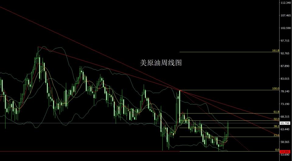 美原油市场上周开盘在61.106的位置后行情先回落,周线最低给到了60.186的位置后行情强势拉升周线最高触及到了66.537的位置后行情整理,周线最终收线在了65.789的位置后行情以一根下影线稍长于上影线的大阳线收线,而这样的形态收尾后,本周64多止损63.7,目标看65和65.5.