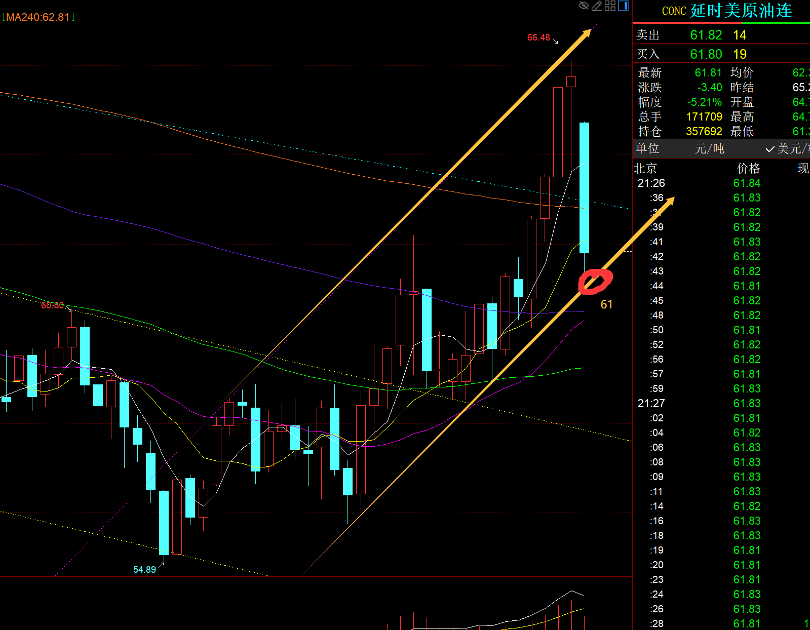 原油方面:原本比较温顺的原油,这几天也发生了稍大的扫盘动作,上周从60一路强势连阳至66.4,整体的上行形态都不错,结果今日低开低走,一根大阴直接又打回原形; 今晚留意61通道下轨支撑,它若失守破位,那么整体的震荡上行反弹也就破坏了;反之,能稳住,出现探底拉升,明日会上行去弥补缺口;