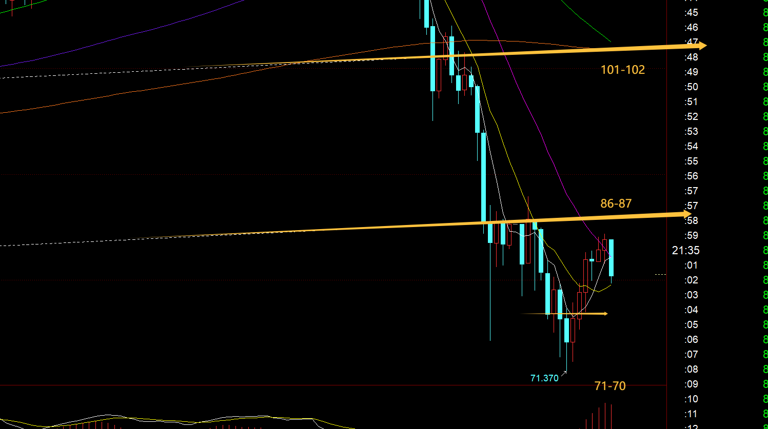 白银方面:今日最低打到71.3,周视频预判的70关键支撑差一点,现在的价格也不适合动手,阻力86-87,除非突破站上它,才好找机会跟随看反弹上行;否则,就可能维持87-70之间的底部整理;