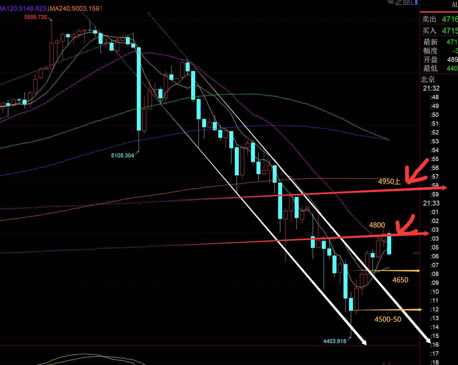 第一,黄金方面:上周五一度恐慌抛售,日内下挫最低4687一线,100米的波动成了平时10米的短线波幅,入场位置不佳或时机不佳,分分钟会秒出局;提示的关键分割位置也容易惯性多杀几十米,给操作上带来了很大的难度; 黄金而言,去年积累下来的趋势北上底仓2735至3730,位置还算可以的,基本上无法下滑打保护,可安心继续持有,高位5540也对了一些盈利对冲保护,至少也保护了300米;
