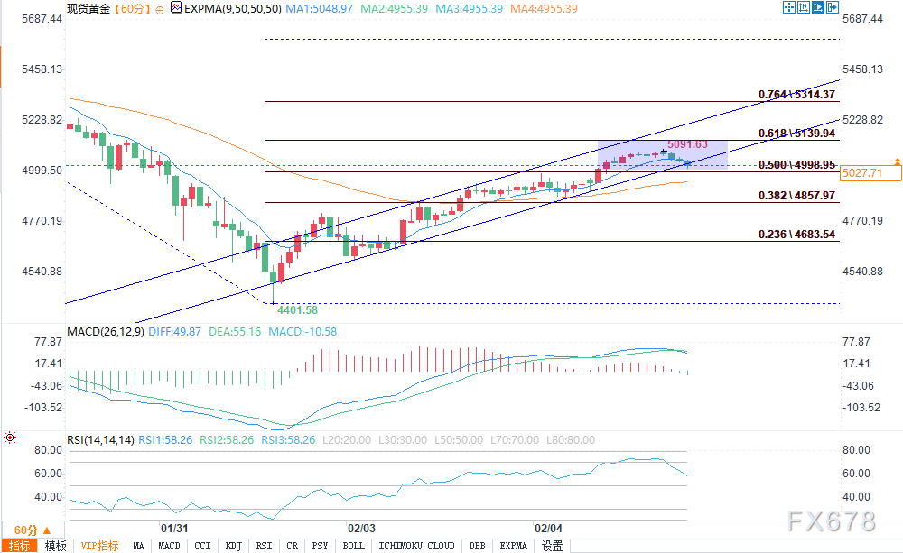 小时图上,价格虽跌破9周期EXPMA,显示短线多头动能有所衰减,但并未形成明确的破位走势。当前市场正测试5000美元整数关口,这一位置与斐波那契0.500回调位(约4998.95)高度重合,是多头的重要心理与技术支撑位。结合前期依托该区间的企稳表现,预计价格大概率会在5000美元上方震荡整理,等待新的动能指引。