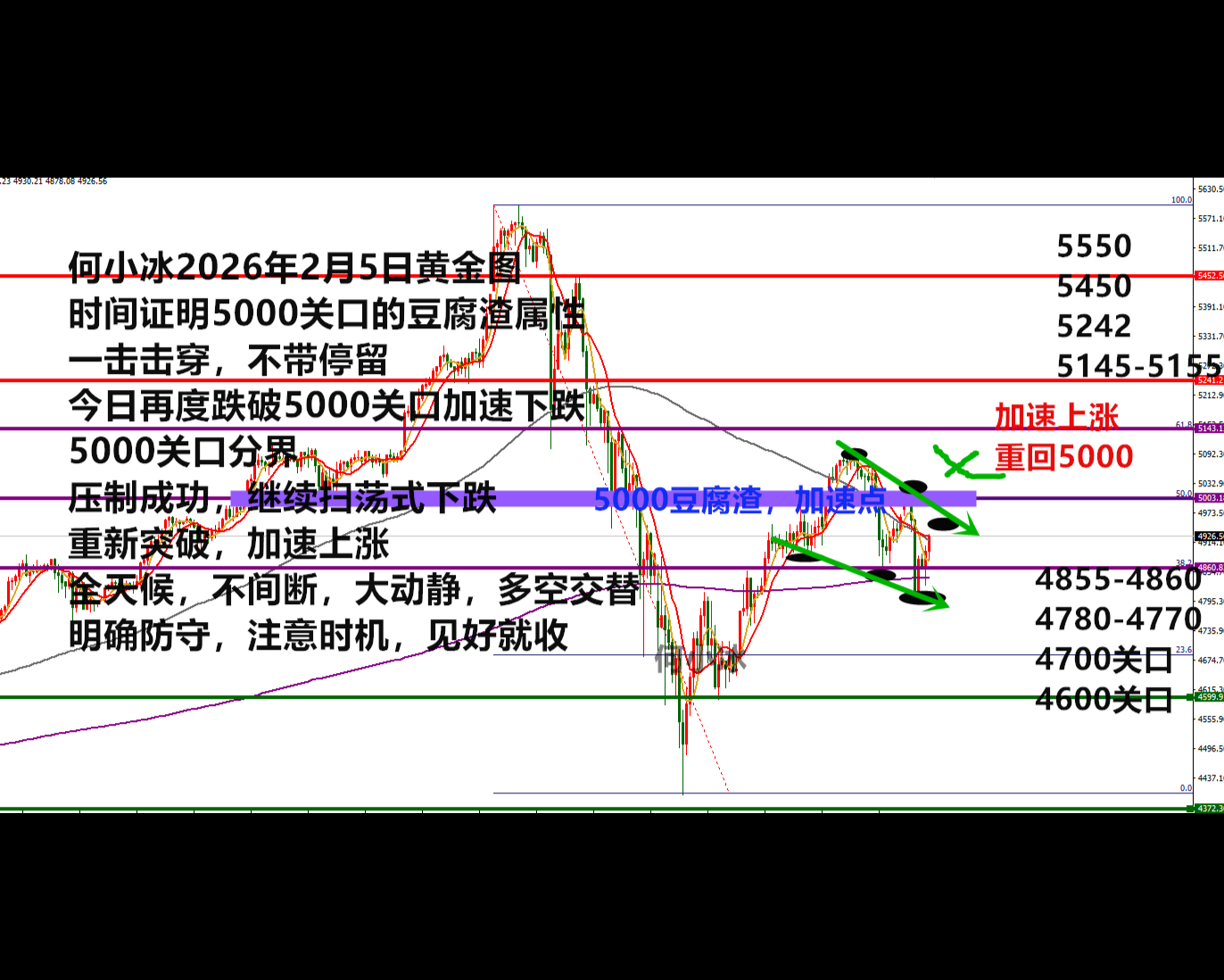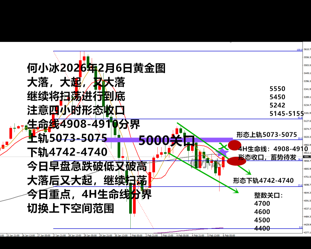 上交易日周四(2月5日):国际黄金遇阻回落收跌至布林带中轨下方,空头再度占据优势,那么,后市还是和之前说的一样,在重回10日均线(5040美元)上方收线之前,走势偏向震荡或再度走低。