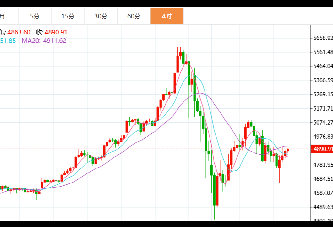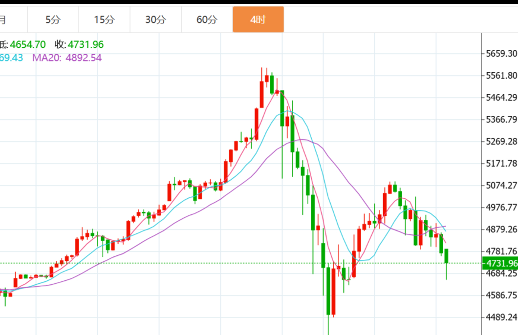 具体走势上,金价自亚市开于4979.36美元/盎司,先行录得日内高点5023.55美元,之后遇阻回落于11点时段触及4790美元附近止跌反弹,但力度难以转强,并维持震荡下移趋势,延续到美盘收盘时段刷新低点,录得4759.88美元日低点,最终收于4779.03美元,日振幅263.67美元,收跌200.33美元,跌幅4.02%。
