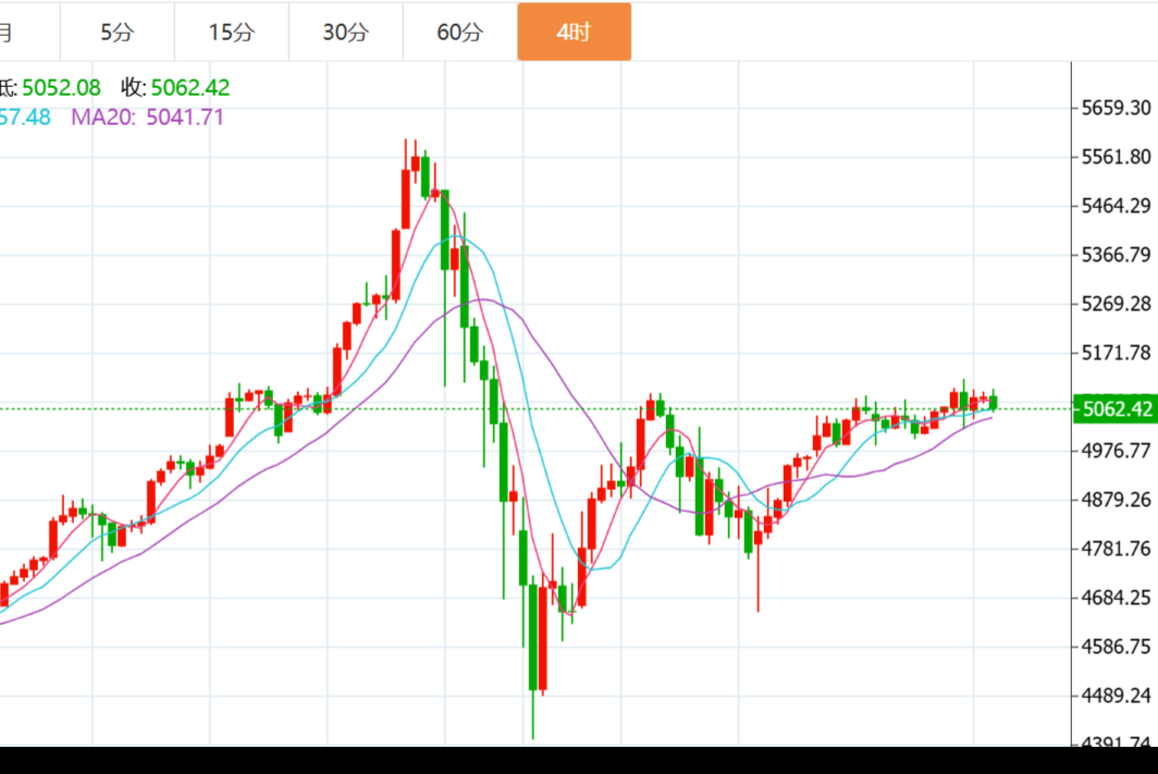 这个我们从小时线上来看会更明显一些,在下方形成一条很明显的趋势线支撑的结构,今天如果再次回撤触及这个支撑线,还是可以继续看北上的,目前来看大概在5010—5020区域。