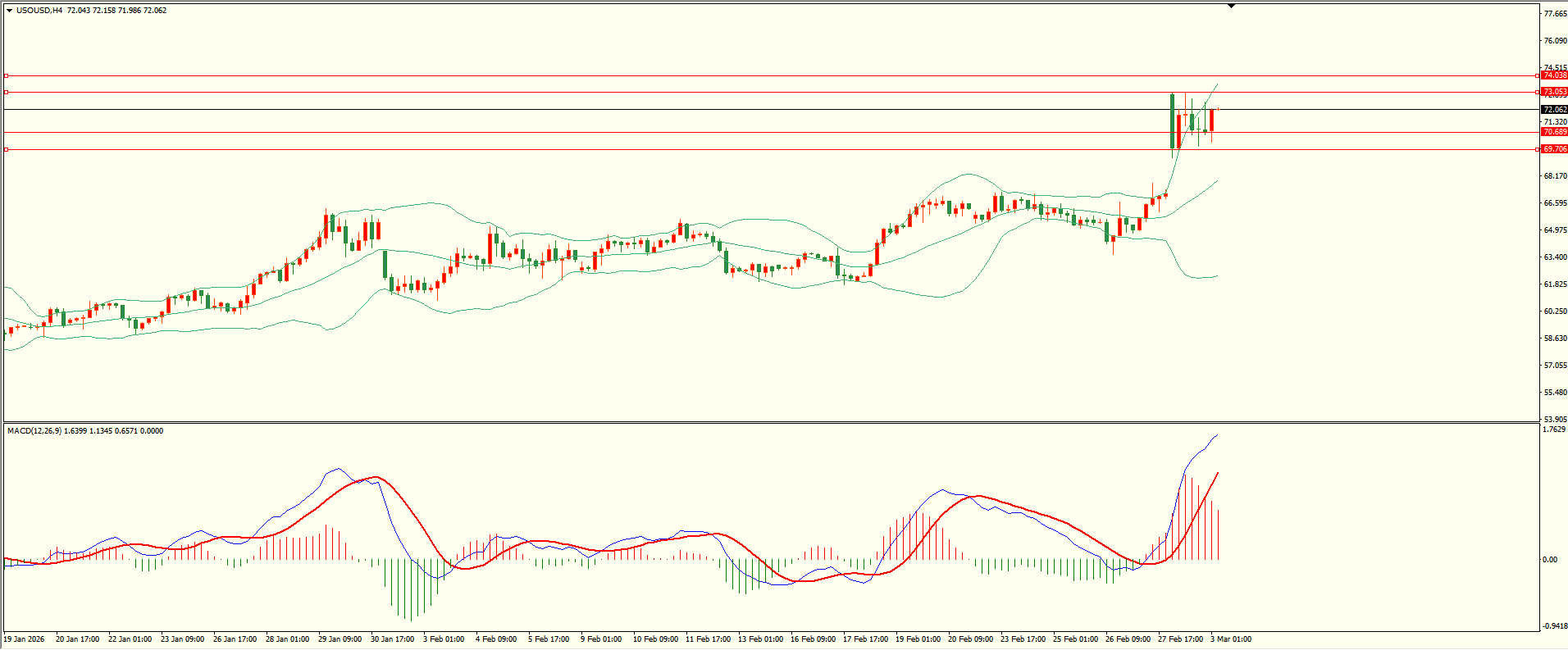 原油昨日亚市开盘后延续走高,盘中触及前阻力冲高回落,日线报收中阴线,下方支撑并未失守,短线谨慎追空,从4H来看,布林中轨偏上,MACD零轴上方运行,日内下方首要支撑70.65,第二支撑69.70,上方阻力73.05,74.00,保持在第一支撑上方短线有望回测第一阻力。