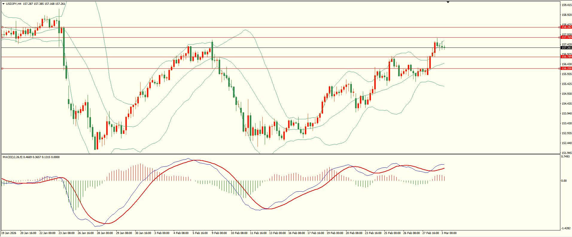 美日昨日小幅调整后延续走高,盘中触及第二阻力小幅回落,日线报收大阳线,收盘位置触及前阻力区,突破后方可打开上升空间,从4H来看,布林中轨偏上,MACD零轴上方运行,日内下方首要支撑156.75,第二支撑156.20,上方阻力157.75,158.20-30,保持在第一支撑上方短线有望回测第一阻力。