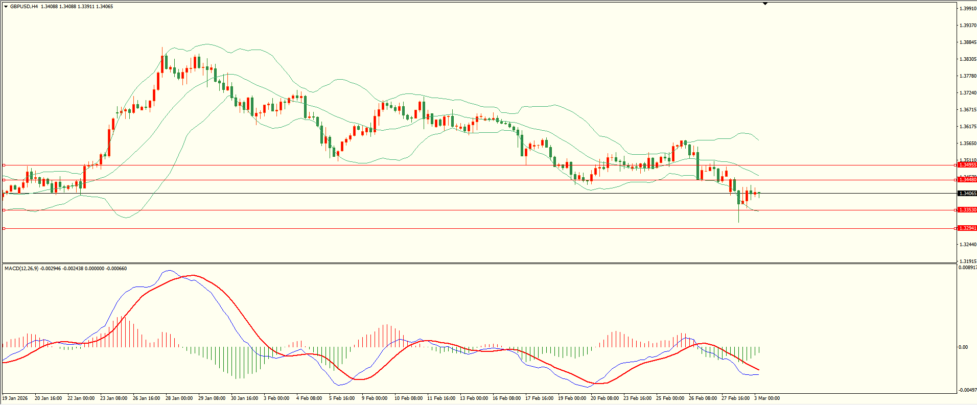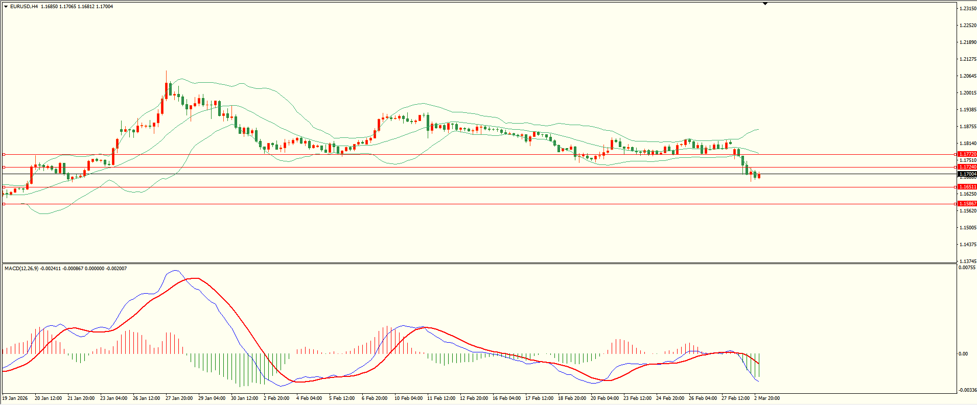 欧元昨日反弹至第一阻力下方延续走低,至收盘回落至第二支撑略有反复,日线报收大阴线,从收盘来看,短线略有偏空,结合4H来看,布林中轨拐头向下,MACD零轴下方运行,日内上方首要阻力1.1725,第二阻力1.1770,下方支撑1.1650,1.1580-90,保持在第一阻力下方短线有望测试第一支撑。