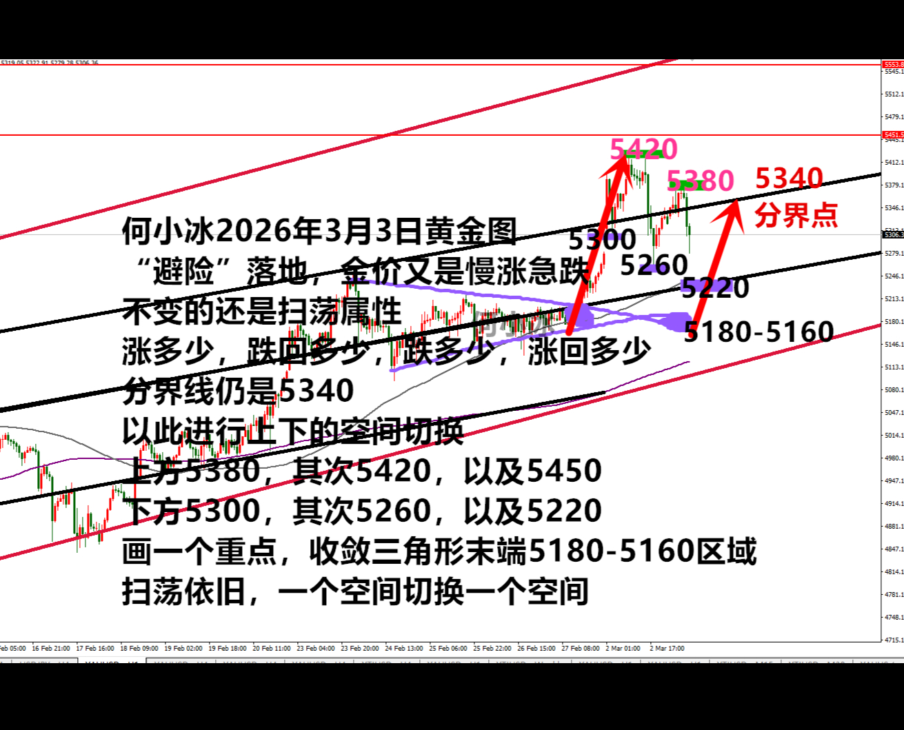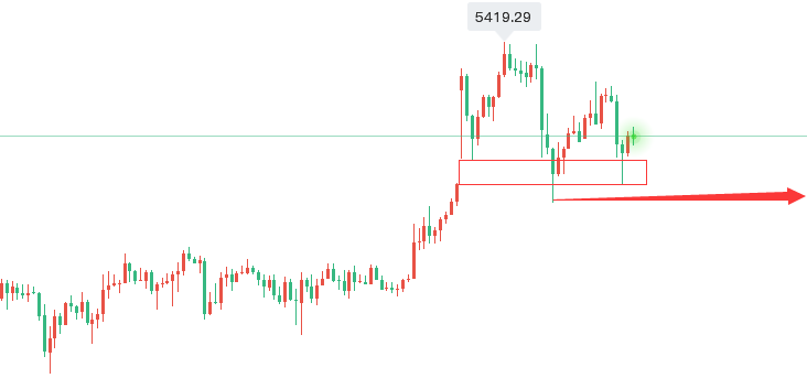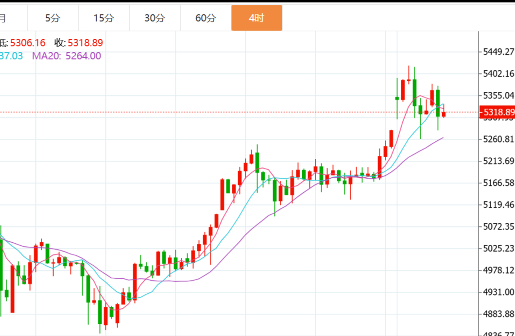 小时线上首要关注的还是缺口回补位置5280一线,其次就是5260,这是昨日低点,保持在这之上依旧有二次上升的动能,所以欧盘先行关注5280附近的情况,做多单跟进处理!