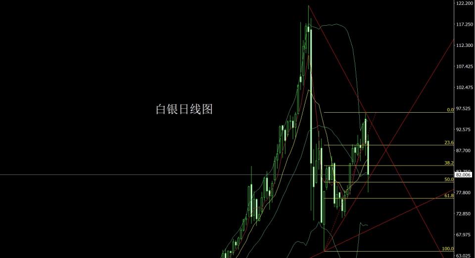 白银市场昨日小幅高开在89.83的位置后行情先拉升给出91.321的位置后行情强势回落,日线低给到了77.868的位置后尾盘拉升,日线最终收线在了82.006的位置后,日线以一根下影线很长的大阴线收线,而这样的形态收尾后,今日早盘如果先回落76.5多止损76.2,目标看78和80和81-82.