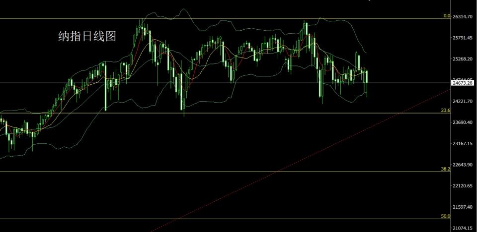 纳指市场昨日小幅高开在24970的位置后行情直接回落,日线最低给到了24311.45的位置后行情强势拉升,日线最终收线在了24678.23的位置后,日线以一根下影线极长的大阴线收线,而这样的形态收尾后,今日的行情24450多止损24390,目标看24600和24700和24800.