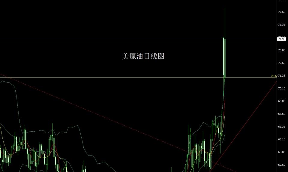 美原油市场昨日开盘在71.2的位置后行情先回落,日线最低给到了70.46的位置后行情强势拉升,日线最高触及到了78.1的位置后行情冲高回落,给出71.72的位置后尾盘拉升,日线最终收线在了74.93的位置后,日线以一根上影线极长的大阳线收线,而这样的形态收尾后,日线阳包阴,今日的行情72.5多止损72,目标看73.5和74.5和75.5和76-77.