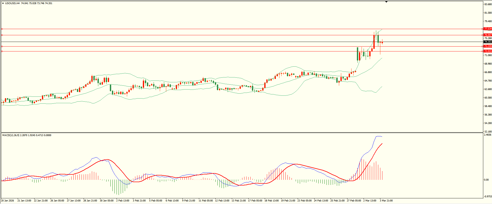 原油昨日小幅调整后震荡上行,欧盘时段触及前阻力冲高回落,日线报收大阳线,短线多头略有占优,从4H来看,布林中轨偏上,MACD零轴上方运行,日内下方首要支撑73.20,第二支撑72.00,上方阻力76.00,77.50-60,保持在第一支撑上方短线有望回测第一阻力。