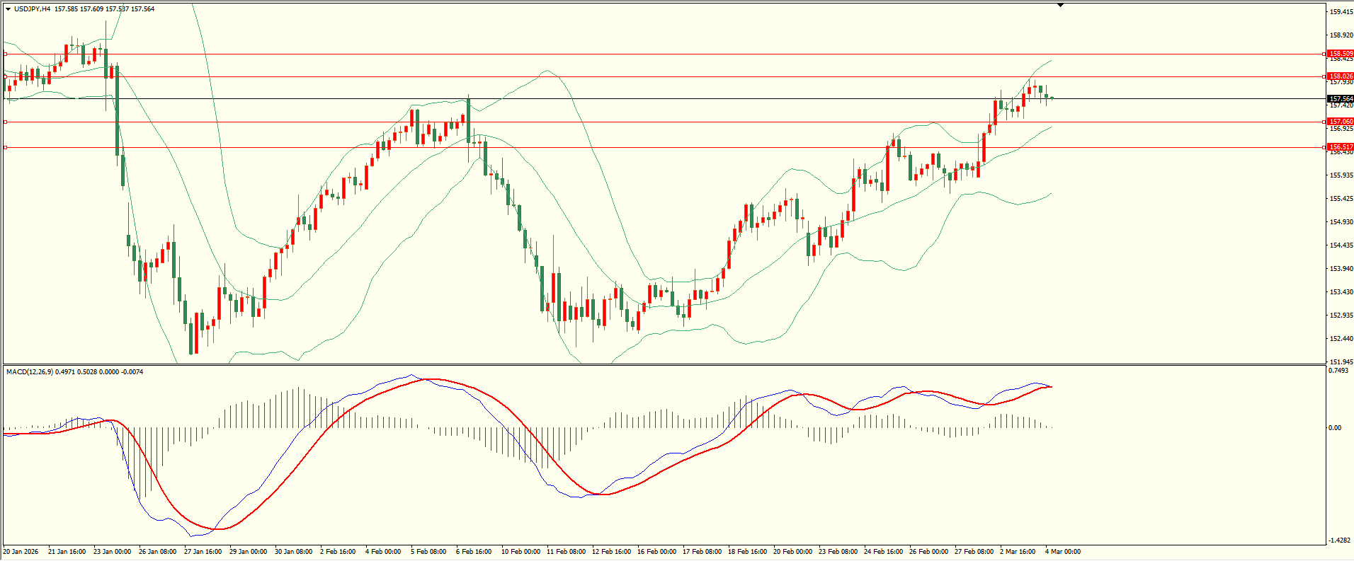 美日昨日小幅调整后延续走高,盘中触及第一阻力承压下行,日线报收小阳线,目前上方阻力犹存,突破后方可打开上升空间,从4H来看,布林中轨偏上,MACD零轴上方运行,日内下方首要支撑157.05,第二支撑156.50,上方阻力158.00,158.50,保持在第一支撑上方短线有望测试第一阻力。