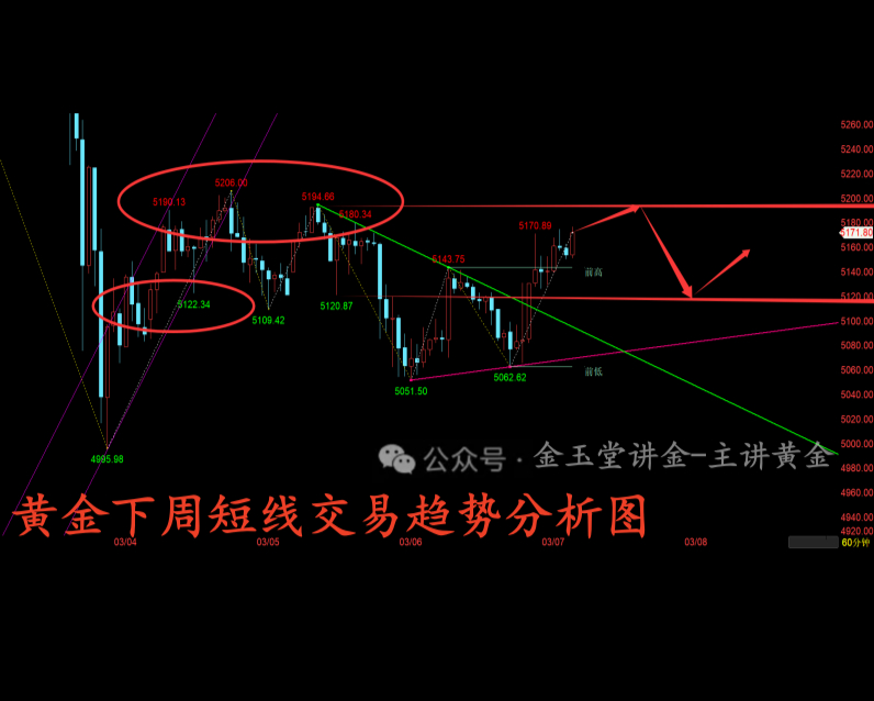 结合本周几天波动来看,其实目前行情已经再次来到了多空都能把握的高点附近了,毕竟前期几次试探了上方5185-5200高点附近都没有进一步突破,那么这次如果下周开盘多头再次延续触及上方5185-5200附近高点依旧开始承压走跌,那么我们也还是可以考虑再度做空一波,下看30-50美金即可!还有一种情况就是,下周开盘可能行情短线会有所回调修复一波,那么根据主看回调做多思路来看,如果黄金有震荡回调的趋势,那么我们等短线回调至下方5080-5120附近即可考虑再度做多,当然如果开盘受到莫种消息面刺激有所砸盘持续单边走跌,那么我们多单防守位再次下放5050-5065附近进场即可!