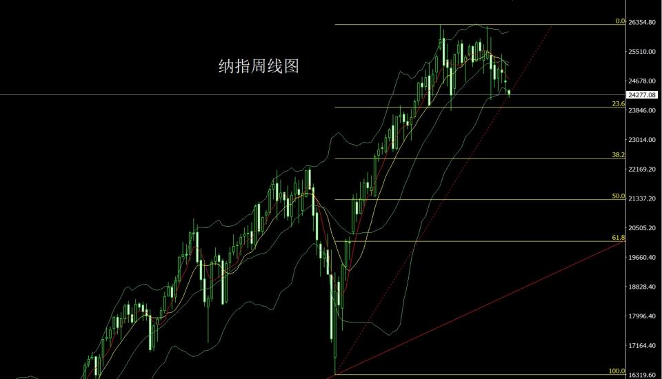 纳指市场上周低开在24672.84的位置后行情强势拉升给出25063的位置后行情回落,周线最低给到了24310.5的位置后二次拉升,周线最高触及到了25205.41的位置后尾盘回落,周线最终收线在了24635.77的位置后,周线以一根上影线极长的射击之星形态收线,而这样的形态收尾后,本周低开在后行情回补缺口给出24650空止损24710,目标看24400和24200和24000-23900.