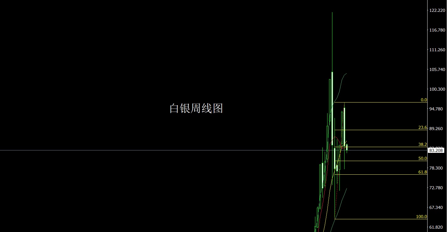 白银市场上周高开在95.015的位置后行情先拉升,周线最高触及到了96.422的位置后行情强势回落,周线最低给到了77.869的位置后尾盘强势拉升,周线最终收线在了84.317的位置后,周线以一根下影线极长的大阴线收线, 而这样的形态收尾后,今日81.65多止损81.3,目标看82.5和83.5和84.5-86