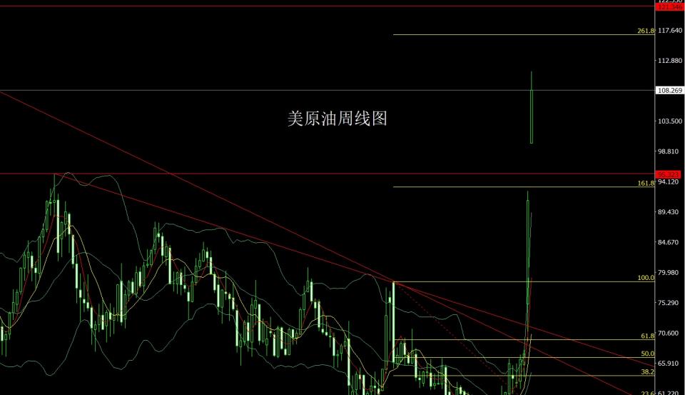 美原油市场上周高开在75.02的位置后行情先回落,周线最低给到了69.26的位置后尾盘强势拉升,周线最高触及到了92.66的位置后整理,周线最终收线在了91.11的位置后周线以一根下影线极长的大阳线收线,而这样的形态收尾后,本周高开拉升后行情只能等待回踩多,点位上,今日103多止损102,目标看108和110和115-118.