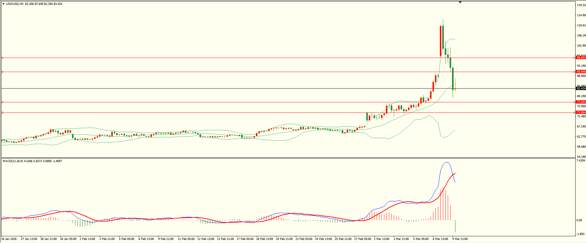 原油昨日先扬后抑,欧盘时段触及第二阻力上方承压下行,日线报收大阴线,短线的震荡加剧,从4H来看,布林上下轨收窄,MACD零轴上方运行,日内上方首要阻力90.65,第二阻力96.60-70,下方支撑77.55,73.10,保持在第一阻力下方短线有望测试第一支撑。