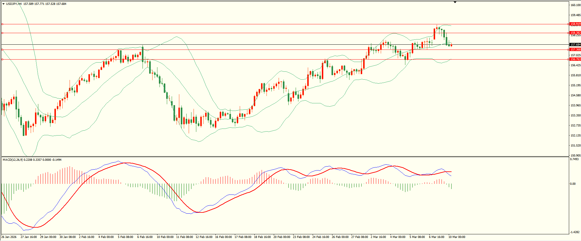 美日昨日小幅走高后冲高回落,纽约盘时段扩大跌幅,日线报收上影线中阴线,上方阻力犹存,同时下方面临多重支撑,短线预防震荡反复,从4H来看,布林上下轨收窄,MACD零轴上方运行,日内上方首要阻力158.35,第二阻力158.90,下方支撑157.35,156.75,保持在第一阻力下方短线有望测试第一支撑。