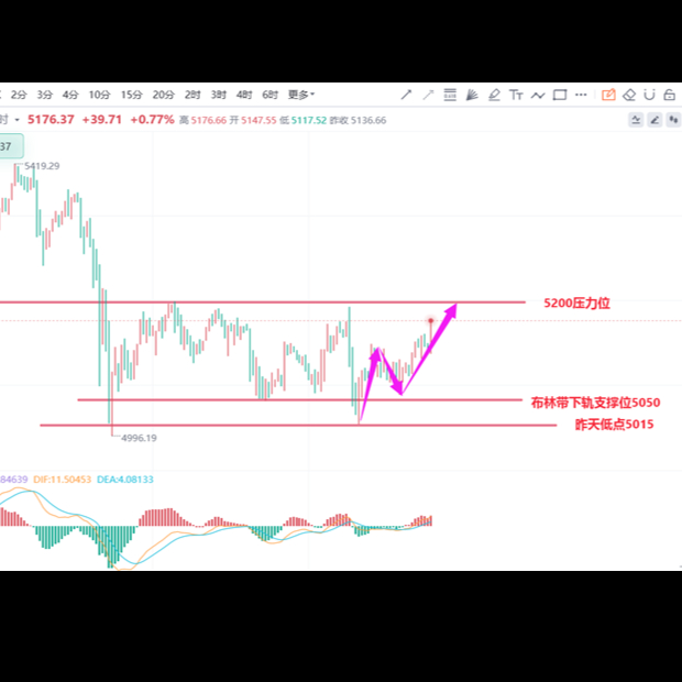 黄金昨日反弹至第一阻力冲高回落,盘中触及第一支撑附近震荡上行,日线报收小阴线,从收盘来看,短线的多空震荡尚未结束,结合4H来看,布林中轨略有走平,MACD零轴下方运行,日内下方首要支撑5116,第二支撑5090,上方阻力5200,5248,第一支撑在没有失守前短线有望测试第一阻力。