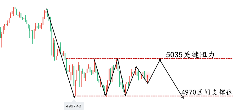 昨晚兴言直播路演的时候有朋友也问到能否在5010做空,兴言也是说到了,做空最好在5030上方进场,而昨晚也是最高上涨至5037一线开始跳水,最低跌至4974一线,符合我们延续看空的思路布局,而从当前的走势上来说,金价迎来了短线的震荡,上方阻力关口在5031-35一线,下方支撑关口则是在4970的关键支撑位置,任意一方的破位都会结束当前的窄幅震荡。