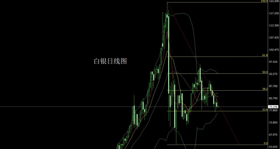 白银市场昨日开盘在80.919的位置后行情先回落给出79.783的位置后行情拉升,日线最高触及到了82.541的位置后行情强势震荡回落,日线最低给到了78.208的位置后整理,日线最终收线在了79.251的位置后,日线以一根上影线很长的的中阴线收线,而这样的形态收尾后,今日的行情先回落76.8多止损76.5,目标看78和79和80-81.