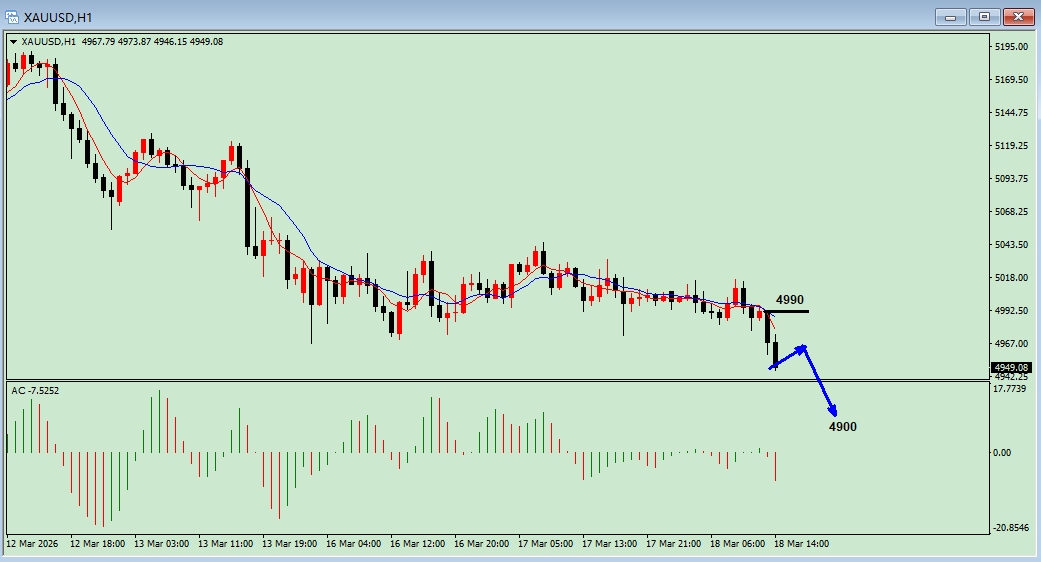 如果到凌晨2点前金价持续承压4990下方,可考虑空单,目标4900