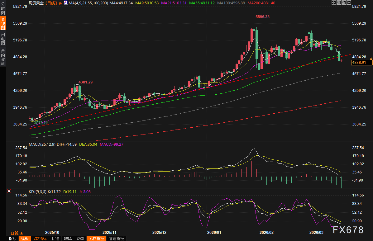 309周三(3月18日)现货黄金经历了剧烈震荡,一度逼近4800美元关口,收盘报每盎司4818.83美元,下跌3.73%,盘中创下超过一个月来的最低水平4807美元/盎司。一方面,中东地缘冲突急剧升级,尤其是伊朗帕尔斯巨型气田遭袭引发连锁报复,布伦特原油维持在110美元以上高位,加剧通胀担忧,打压美联储降息预期;另一方面,美联储最新决策维持利率在3.50%-3.75%不变,并释放出通胀顽固、降息路径谨慎的信号,提振美元指数大涨,共同对金价形成打压。周四(3月19日)亚市早盘,现货黄金低位徘徊,目前交投于4838.75美元/盎司。