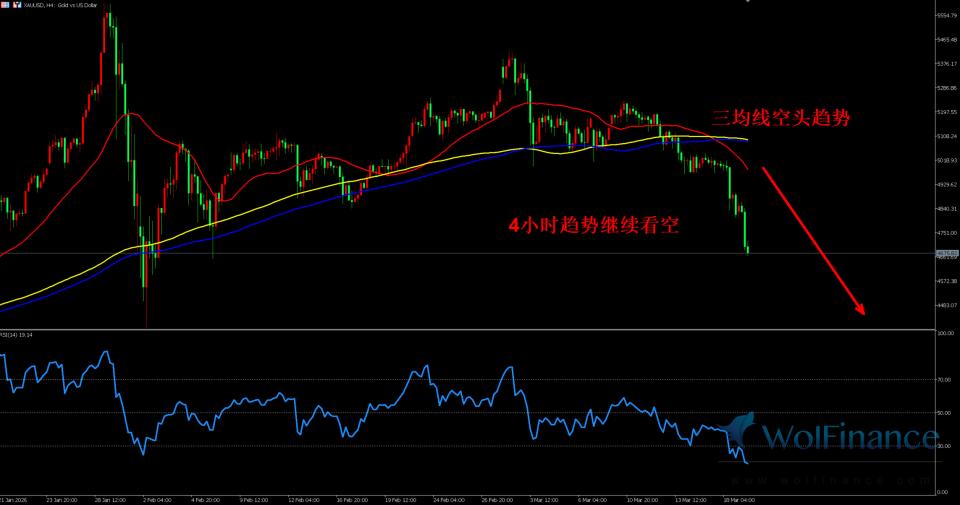 周四(03月19日)美盘前(欧盘时段),现货黄金短线低位震荡修整,当前报价 4689 美元 / 盎司,日内交投于 4683-5003.67 美元 / 盎司区间,空头趋势依旧主导盘面。基本面:美联储此前已正式公布3月利率决议,维持 3.50%—3.75% 基准利率不变,最新点阵图大幅下调年内降息预期,释放明确鹰派信号,叠加鲍威尔讲话重申通胀管控优先,高利率维持周期进一步拉长,直接推升美元指数与美债收益率同步走高,持续压制无息黄金的持有价值,资金持续从贵金属市场流出,成为金价下行的核心驱动力。除此之外,从当前宏观市场其他观点来看,原油价格高位运行虽小幅抬升全球通胀预期,但市场现阶段交易重心完全聚焦货币政策走向,避险与通胀支撑逻辑暂时失效;同时全球黄金ETF持仓出现阶段性减持,投机资金空头持仓占比攀升,进一步加剧盘面弱势,仅有中东地缘局势持续紧张为金价提供微弱底部支撑,难以扭转整体空头格局,整体呈现决议利空消化、短线超跌酝酿小幅反弹,反弹后仍延续空头的走势格局。