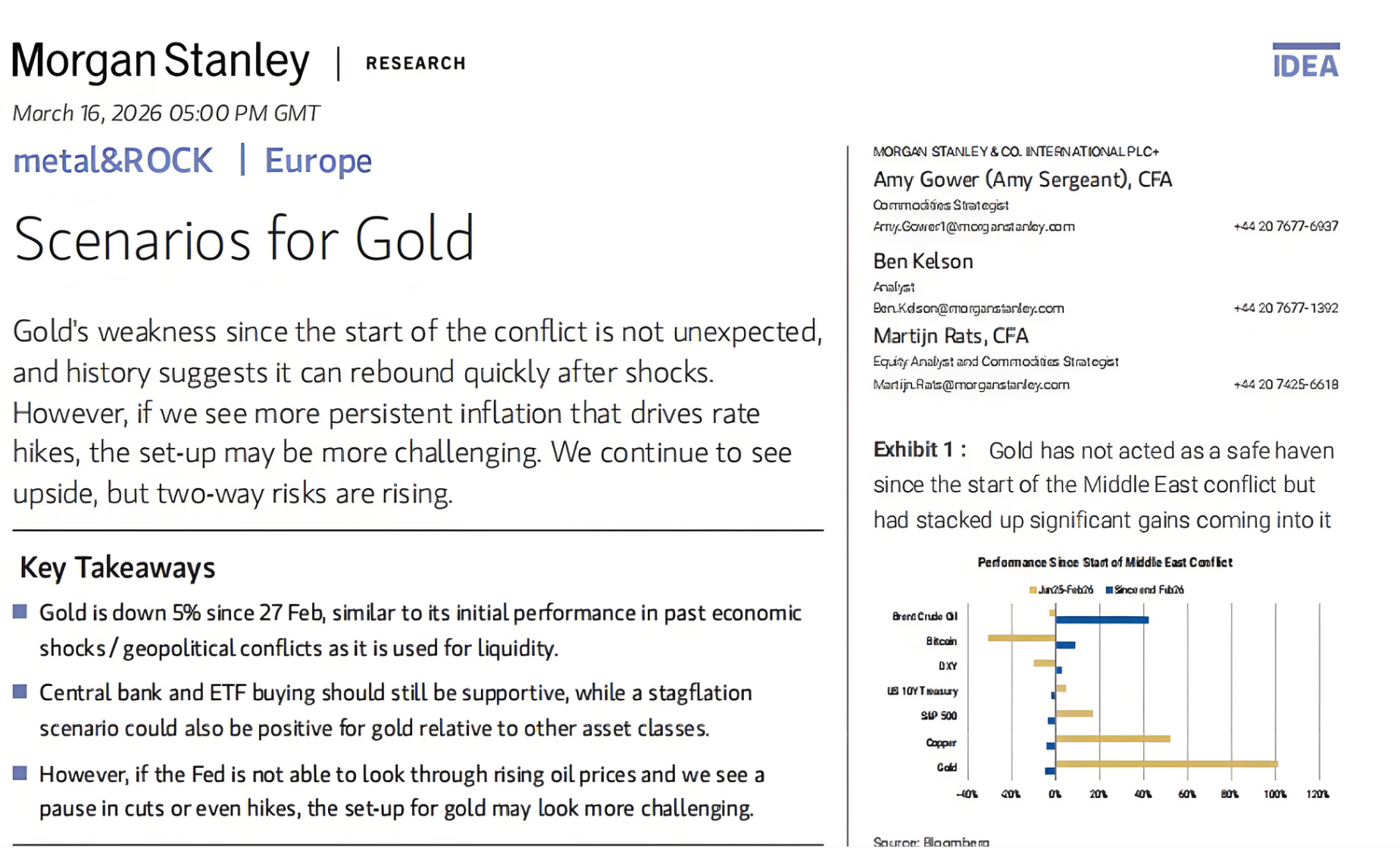 大摩最新观点(3月16日《黄金情景分析》): 黄金更像风险资产,而非纯避险资产。近期伊朗冲突升级,金价不涨反跌,正是美联储政策才是核心估值锚(非地缘事件)。