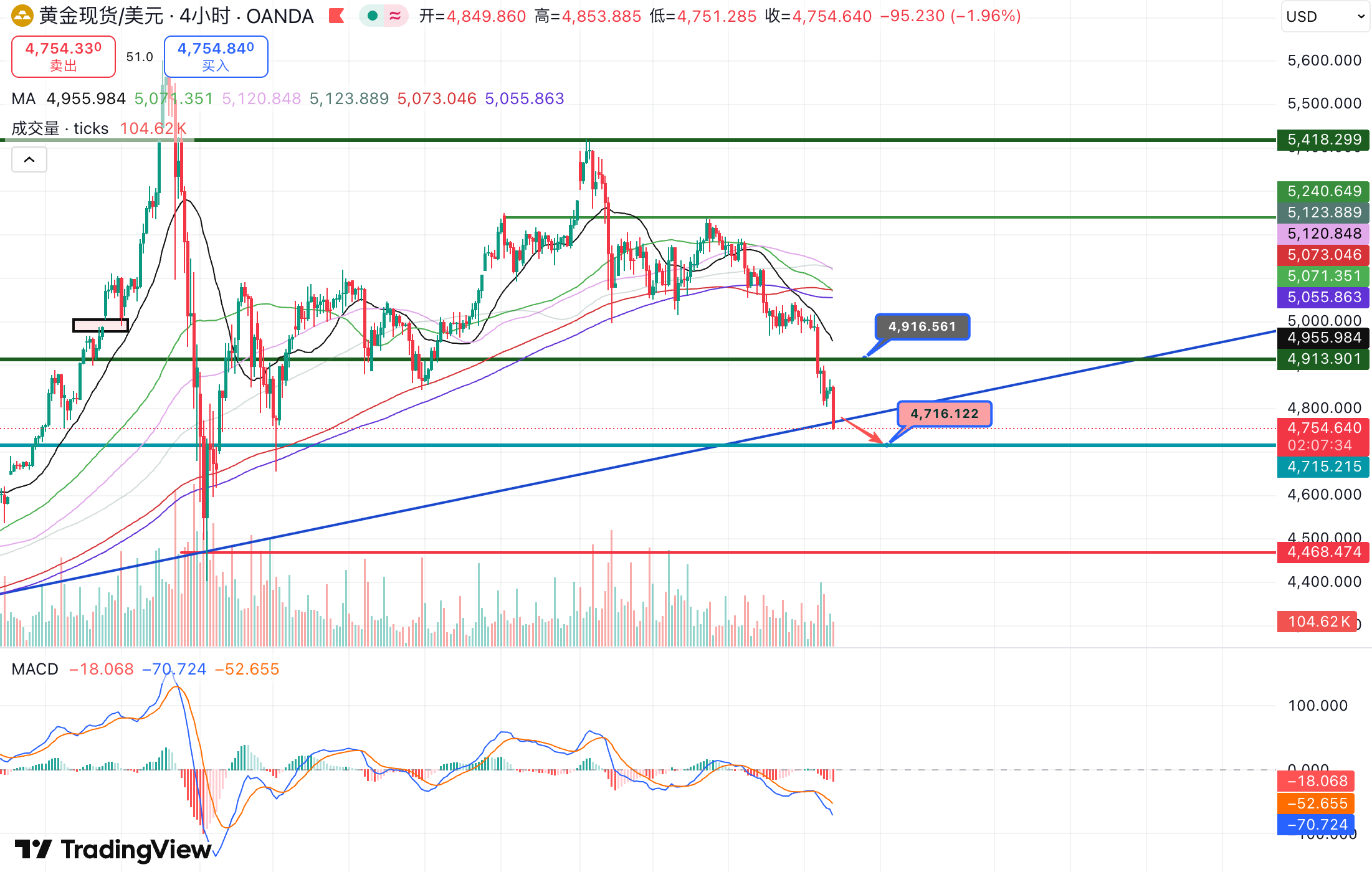 221欧市开盘前,黄金突然放量急跌,已跌破4780低点。1小时图成交量大幅扩张,MACD在弱势区死叉确认,加速下行动能强劲,欧盘初段大概率延续跌势,刺破上升趋势线。