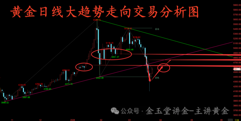 4小时级别:底部特征更为清晰,4100美元为终极底部,4300美元为次级别底部。尽管本轮上涨由消息面刺激触发,但形态上已完成结构性上涨基础,均线粘合后抬头向上发散,中期趋势正式转向偏多。价格呈现超跌反弹结构,高点逐步抬升,短期虽在4600美元上方面临一定抛压,但只要站稳关键支撑,反弹格局不改。若能有效站稳4600美元上方,下一步将直接冲击布林带上轨4750美元目标位。