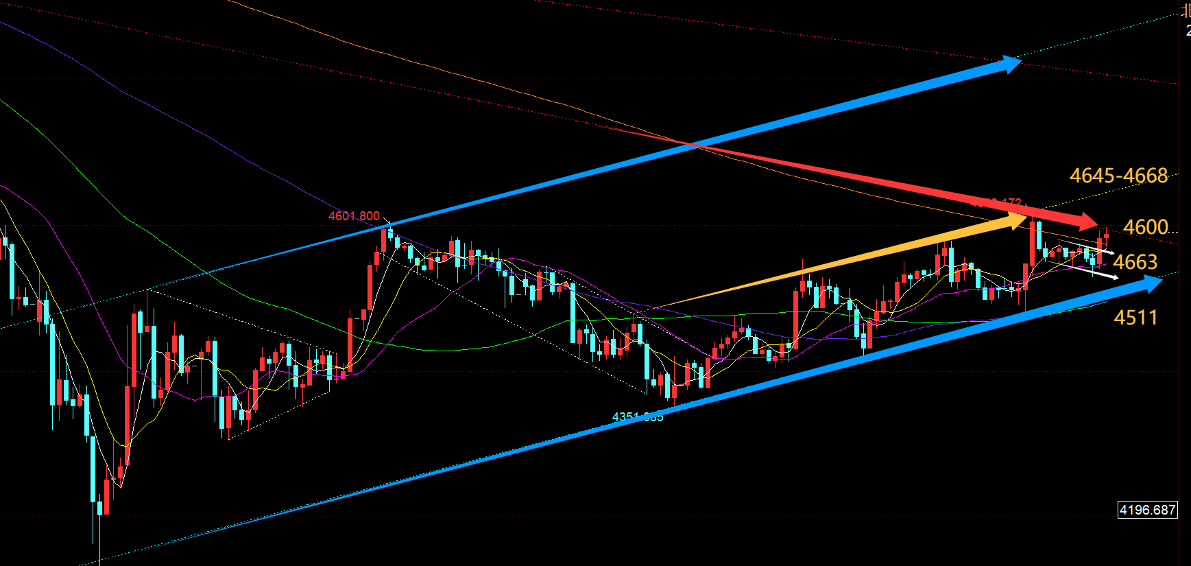 第二,黄金小时线级别:当前通道是比较明显,大家都知道,低点逐步上移,高点逐步上移,运行于上行通道内,下轨支撑已上移4511上,上轨阻力4645上;而中途4600一线是昨日研报提及的前期某一条趋势阻力线,只有突破站上4600,才能有测试上轨的动能,首次触及4645-4668应该还会冲高回落,因为macd或有些背离;当然若直接突破站稳上轨,放量上拉的话,背离就可以暂时忽视,这种是小概率,那样就基本很快试探4800;下方支撑先留意4663,短期均线支撑,50%分割支撑,也是欧盘运行白色小通道回踩确认支撑;只要蓝色通道下轨不失守,则继续维持震荡上行为主;