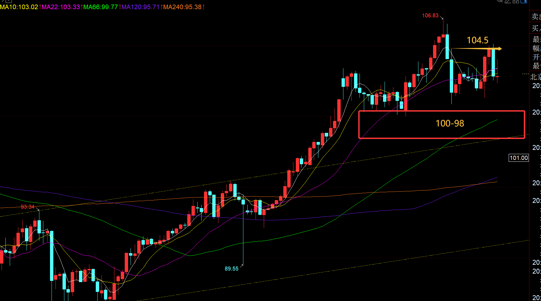 原油方面:早间快速打压一波,欧盘反弹确认了618分割阻力104.5,存在阻力压制再度回落;今晚 阻力104.5,支撑100-98,看此区间的运行得失; 往上突破站上则继续维持强势;往下跌破则打压回归前期黄色通道内的震荡;美伊局势一旦缓和,油价瞬间大幅跳水依然是很快,力度也会很大,这是迟早要面对的;