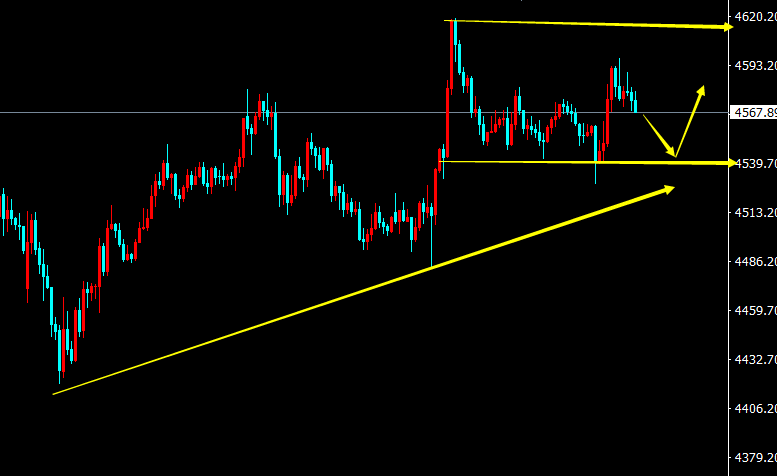 【周二操作】:黄金短线先回撤于4543-40附近做多,目标4580-4600附近,损4530。