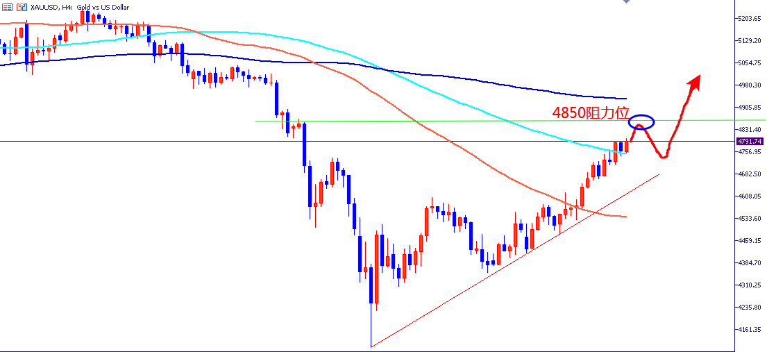 技术面,黄金日线四连阳拉升,日线级别均线多头排列,MACD 红柱放量,趋势偏强。但 4 小时 RSI 逼近超买区,KDJ 高位拐头,多头动能衰减。4850-4820 美元构成强压带,下方支撑 4700-4720 美元,短期难以直接突破,高位震荡后回落概率大。