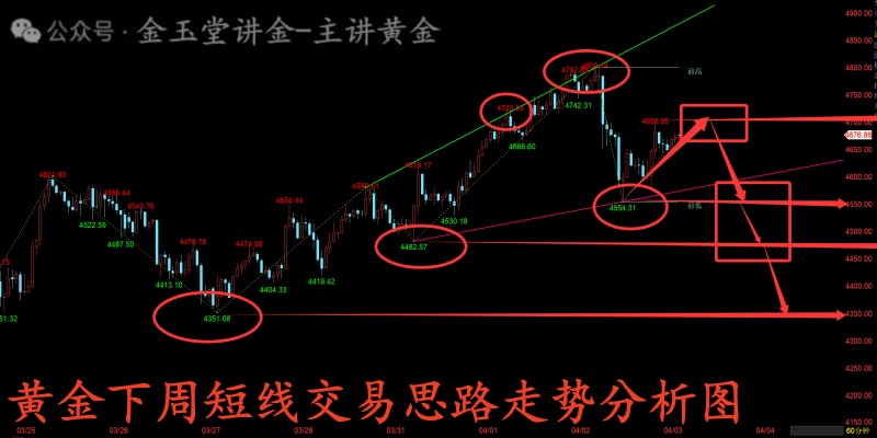 359黄金周四由于老特再度宣布继续打击伊朗,将原本的停战协议再度撕毁让美伊冲突再度加剧,而周四的短线行情也是顺势探顶上方4800关口压制后开始大跌了一波,那么结合周四的技术面和消息面刺激来看,整体的趋势开始逐步转向了空头,不过由于周五耶稣受难日停盘加之周末停盘影响,周四的行情并没有完全直接走跌下去,这也导致有的投资朋友就会认为行情依旧还是看多为主,毕竟空头没有强势延续,就说明多头依旧趋势还没改变,但现在不管是技术面上的压制还是消息面上的刺激,可能多头都不占优势,当然具体等周一开盘之后行情走出来就可以看出行情到底是走空还是继续走多了!