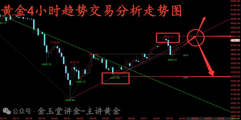 目前回归行情来看,黄金周四由于老特再度宣布继续打击伊朗,将原本的停战协议再度撕毁让美伊冲突再度加剧,而周四的短线行情也是顺势探顶上方4800关口压制后开始大跌了一波,那么结合周四的技术面和消息面刺激来看,整体的趋势开始逐步转向了空头,不过由于周五耶稣受难日停盘加之周末停盘影响,周四的行情并没有完全直接走跌下去,这也导致有的投资朋友就会认为行情依旧还是看多为主,毕竟空头没有强势延续,就说明多头依旧趋势还没改变,但现在不管是技术面上的压制还是消息面上的刺激,可能多头都不占优势,当然具体等周一开盘之后行情走出来就可以看出行情到底是走空还是继续走多了!