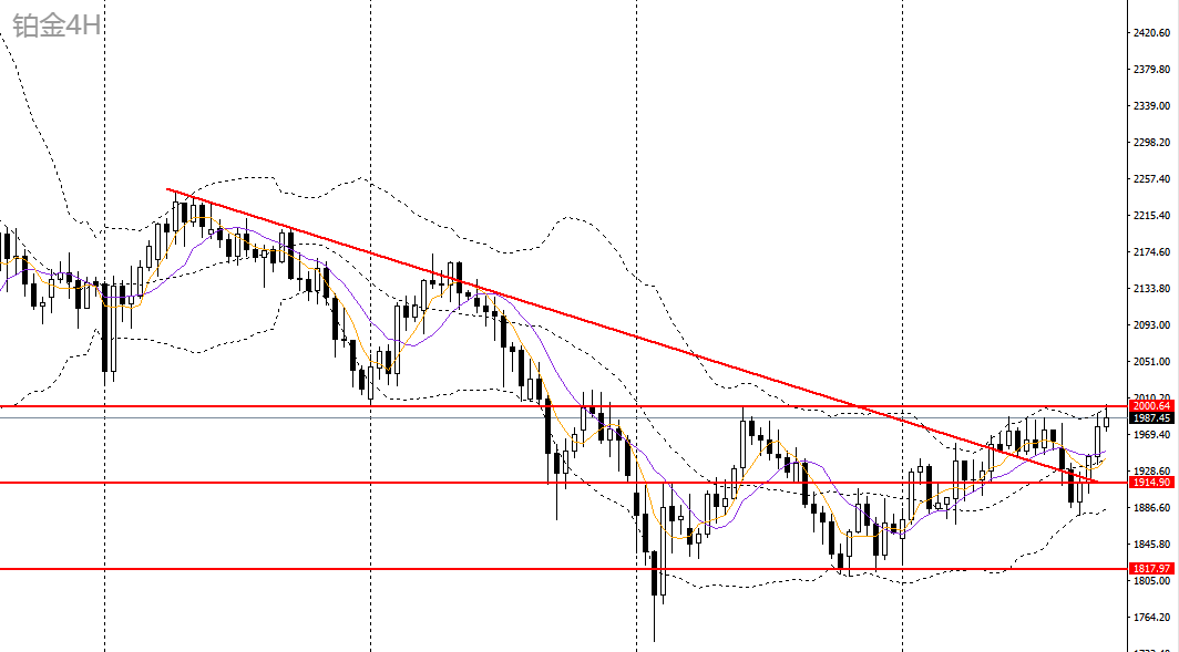 铂金昨日小幅反弹,站上5日均线,4小时站上1900关口,且触及2000一线阻力,多单仍可持有,如正式升破2000,可看多至2020。