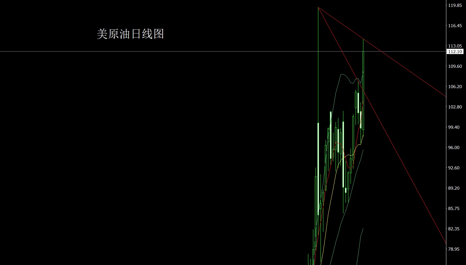昨日美原油市场早盘开盘在98.9的位置后行情回踩97.66的位置后行情受到美国总统强势讲话影响强势拉升,日线最高触及到了114.2的高点后整理,日线最终收线在了112.1的位置后,日线以一根上影线长于下影线的大阳线收线,而这样的形态收尾后,下周行情能否延续这一势头还是需要看美以伊的战争烈度。