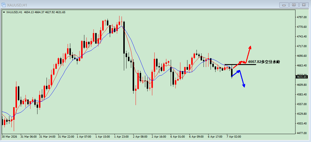 今日早间黄金价格小幅反弹至4667.82后开始回落,那么4667.82便是今天的多空分水岭,破了就可以做回调的多,不破则可以找位置做空。
