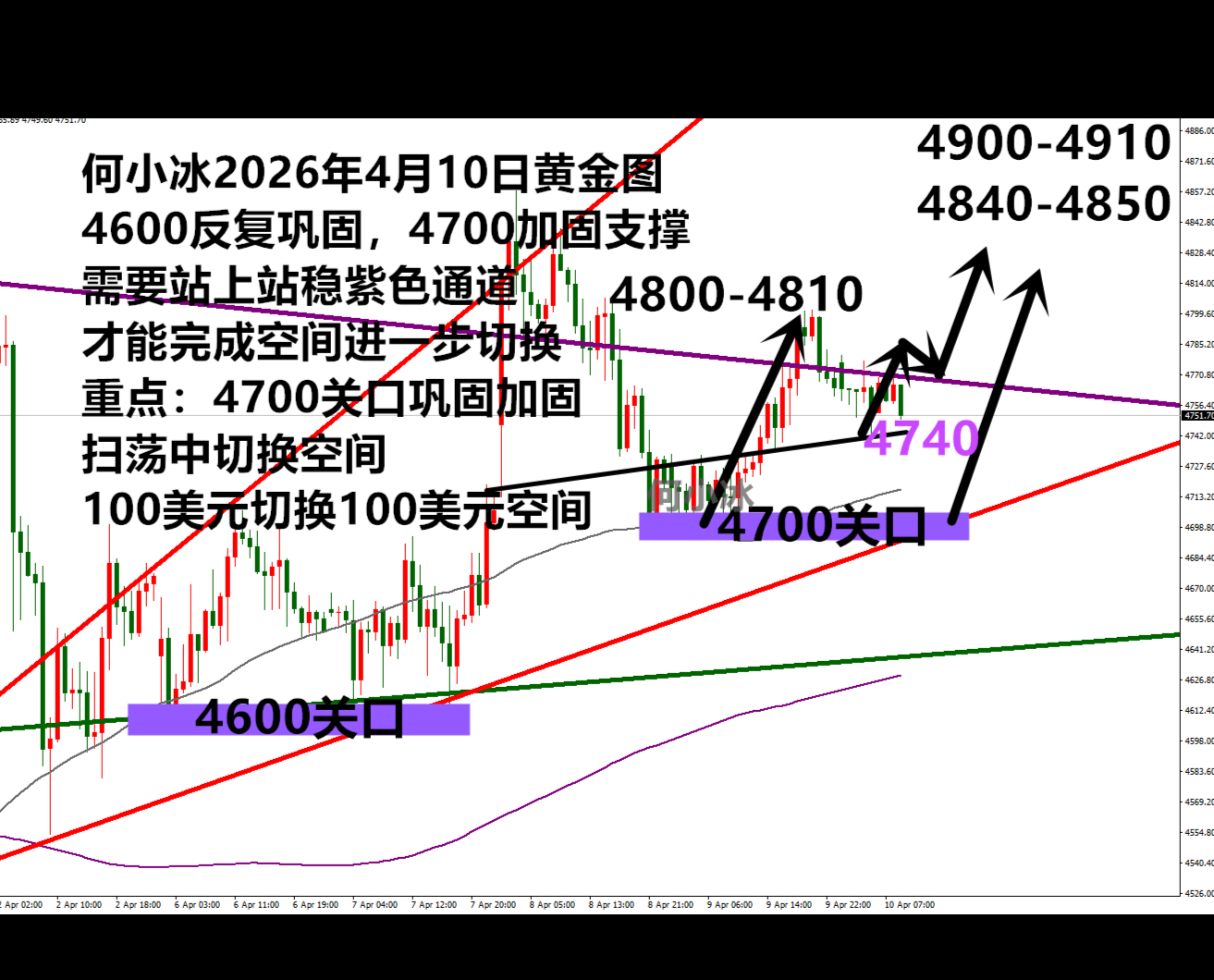 紫色通道线范围在4790区域,也是早盘破高后两度回踩确定的支撑