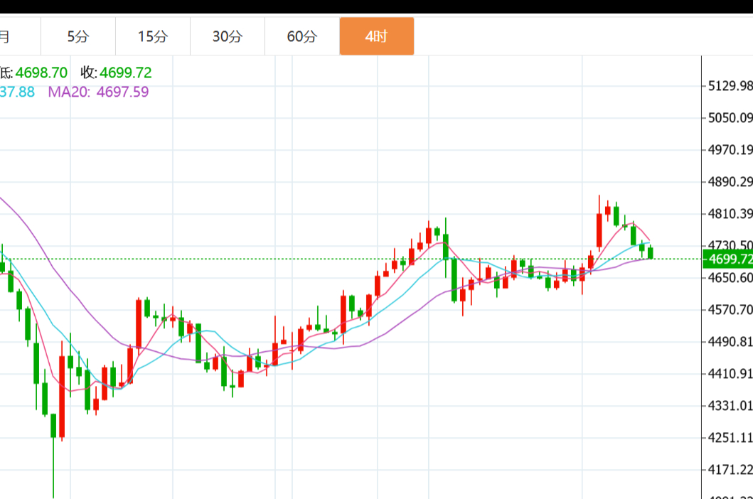 也暗示短期再度面临回撤调整,下探4600或4400美元的风险,上方则继续关注30日及60日均线阻力压制。