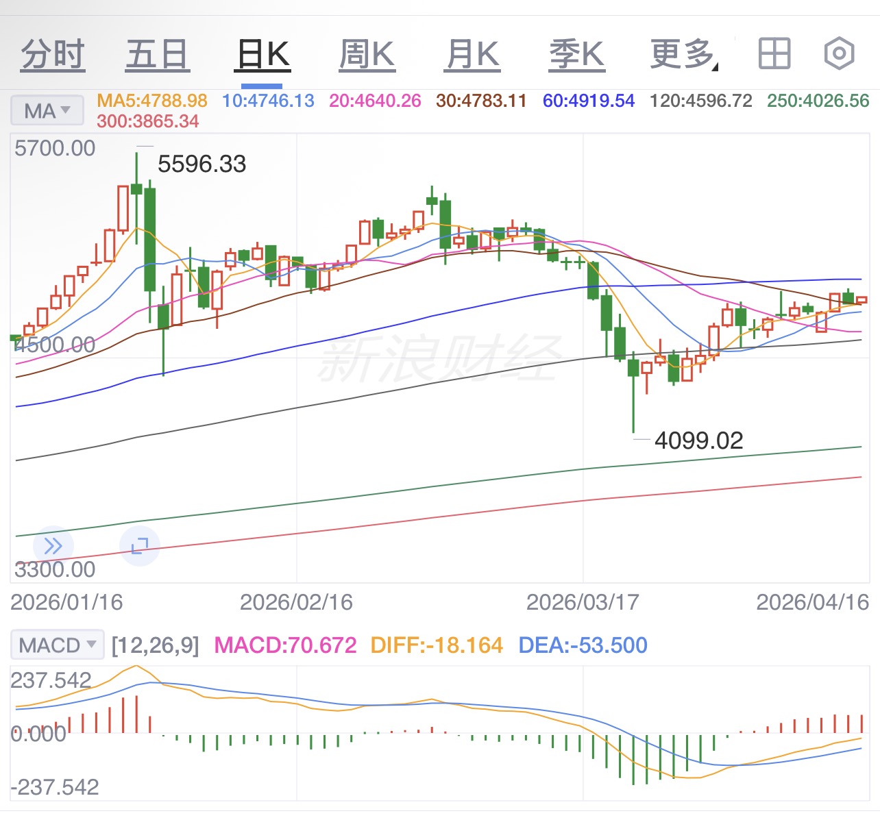 国际黄金行情,昨天黄金冲高回落收小阴,但多头还要抵抗,今天继续关注冲高回落。压力还是60日均线以及10周均线,极限最近反复强调的三月最后一波低点4980-5000区域,短期压力4830~35区域。