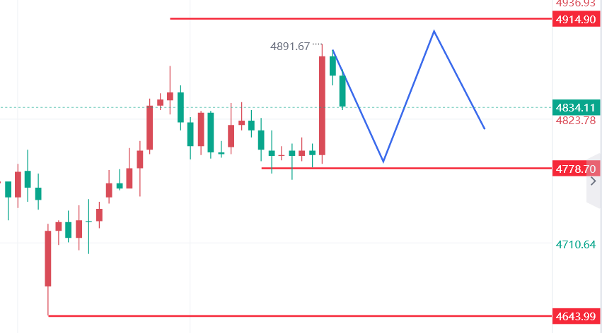 周五消息面频繁切换,金价走出典型冲高回落。先是受海峡开通影响冲高至4891 美元,随后伊朗再度宣布关闭海峡,金价自高位回落至4830 美元附近,最终守住 4800 美元上方震荡。这种走势下,多空分歧剧烈。对中长线交易者而言,当前位置并不适合贸然入场;但对短线来说,黄金仍有继续冲高4900—5000 美元区间的动能,仅适合快进快出。中期震荡格局并未结束,这一波反弹若在 5000 附近承压,再度回落的风险依然存在。因此,中长线投资者继续耐心等待回调机会即可。
