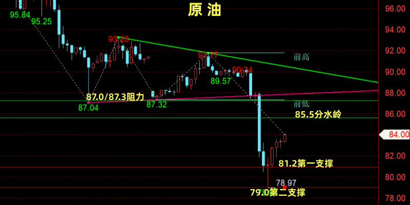 个人建议:激进反弹85.5±2区间进场,稳健等87.1附近再空,破88.2损,目标82.0破位持有!